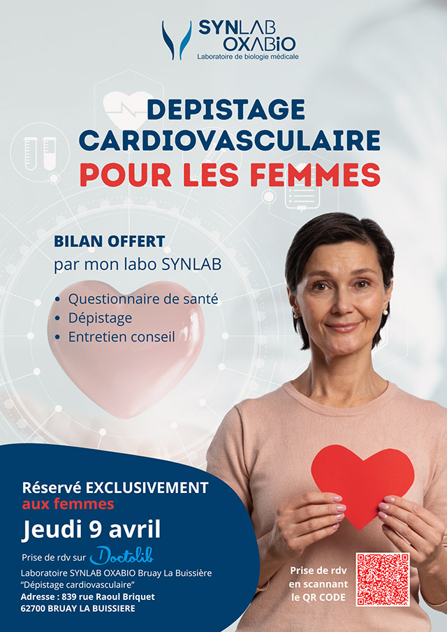 rdv sur le Doctolib SYNLAB OXABIO DOUAI, puis dépistage cardiovasculaire réservé aux femmes (ouvert 1 mois avant la date du dépistage)